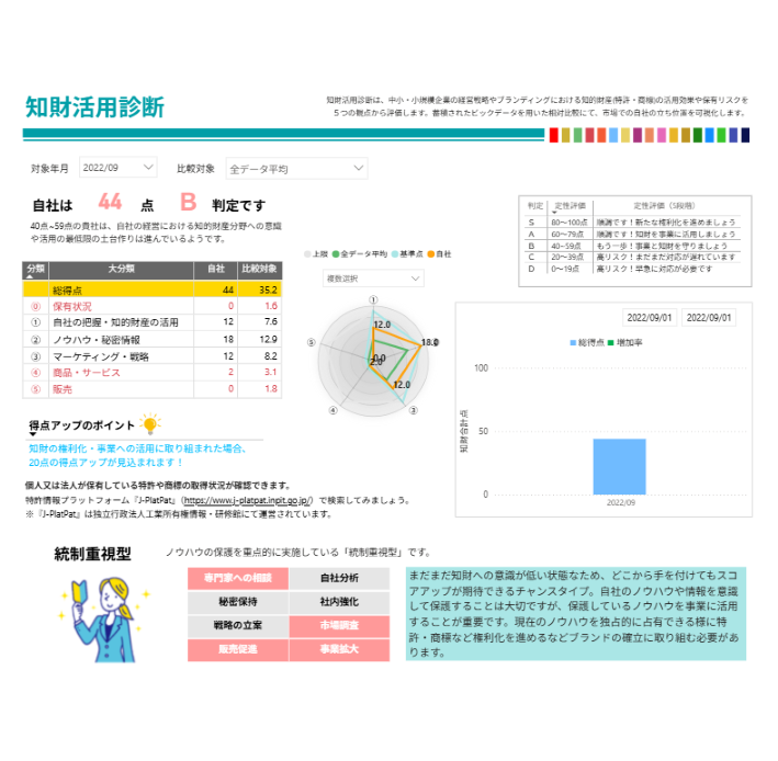 しかし、何から手をつければよいかわかりません。そこで、きづなPARKの「知財活用診断」を実施しました。これは、中小・小規模企業の経営戦略やブランディングにおける知的財産(特許・商標)の活用効果やリスクを17項目によりチェックする診断です。その結果は44点のB判定。内訳は、自社の知財の把握はできているものの、事業への活用はできていないという評価でした。