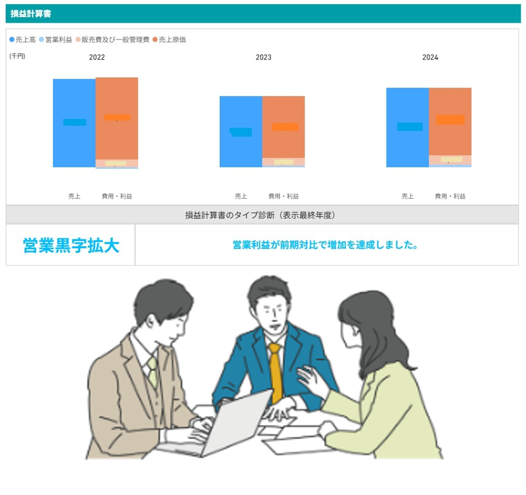 売上は増加傾向なのに赤字となった、その要因は何かを経営情報から分析するため、きづなPARKの「決算書3ヶ年分析」を活用しました。