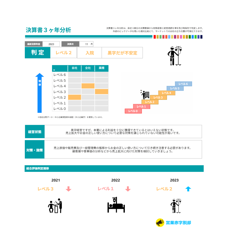 経営状態を確認するために、きづなPARKの「決算書3ヶ年分析」を用いて分析を行いました。