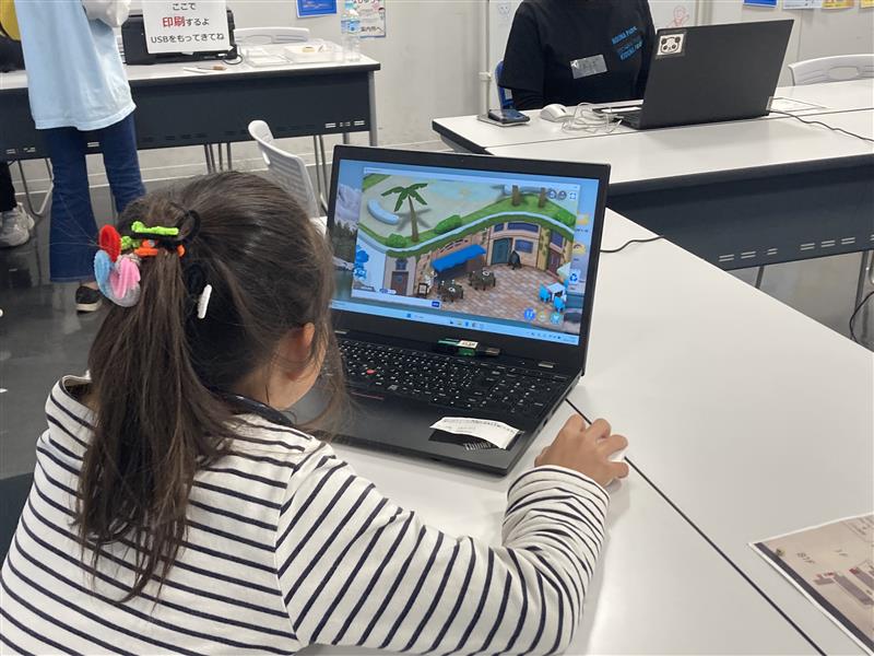 「企業ドクター」のお仕事は、お店の課題をみつけて、どのように解決したらよいかを考え、実際にポスター作成や音楽作成をして課題解決に向けた活動の実施までやってもらいました。お店の課題をみつける体験では、きづなPARK内にある「オリナスメタバース」を利用して、企業ブースで困ったお店の課題をみつける体験をしました。